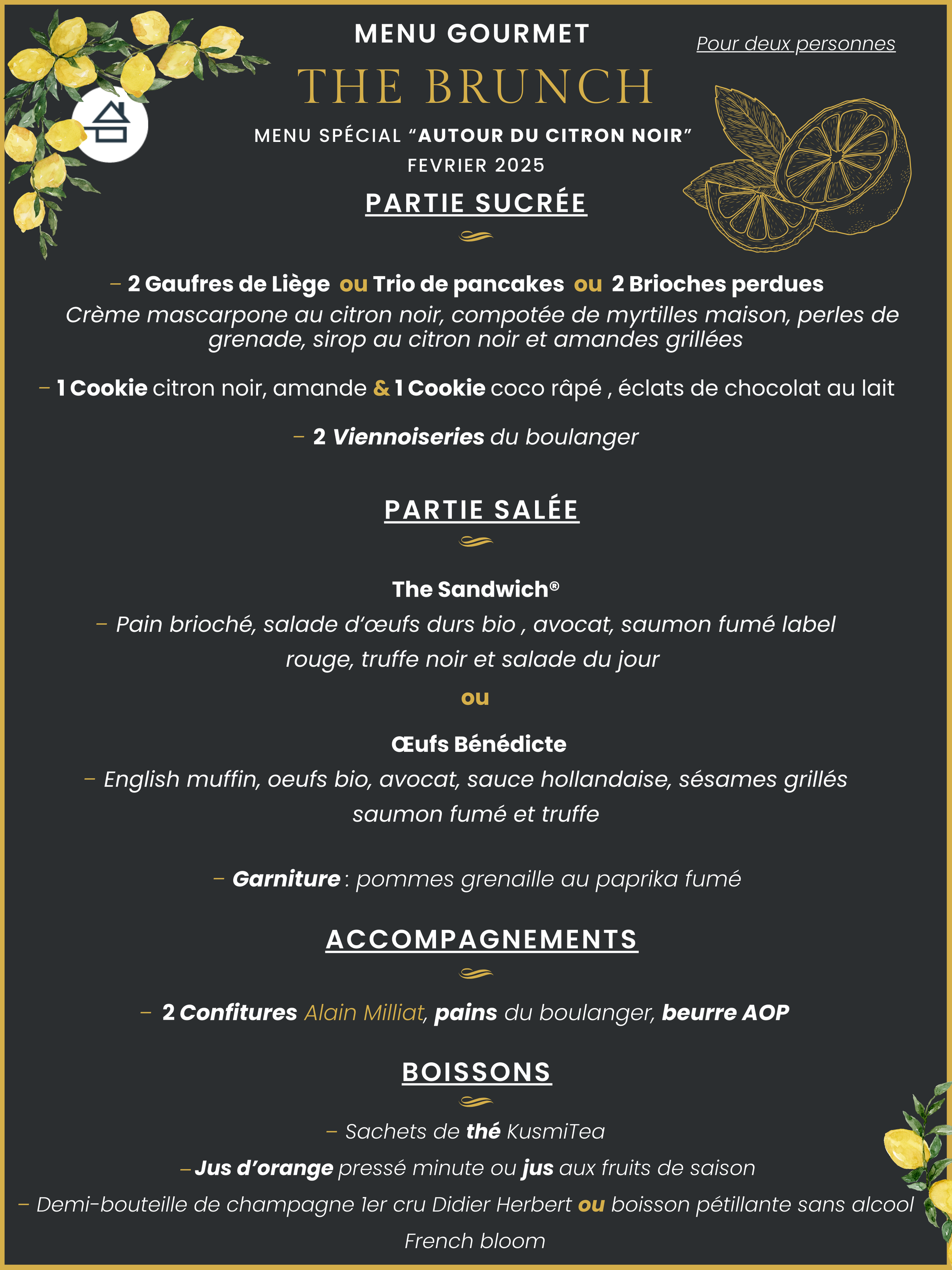 Laissez-vous séduire par nos œufs Bénédictine, agrémentés de copeaux de truffes fraîches. Pour accompagner ce festin, savourez une demi-bouteille de Champagne Didier Herbert 1er Cru, offrant une effervescence parfaite pour célébrer. Notre brunch gourmet, au-delà de l'ordinaire, vous promet une expérience culinaire exclusive, idéale pour des moments d'exception à partager.